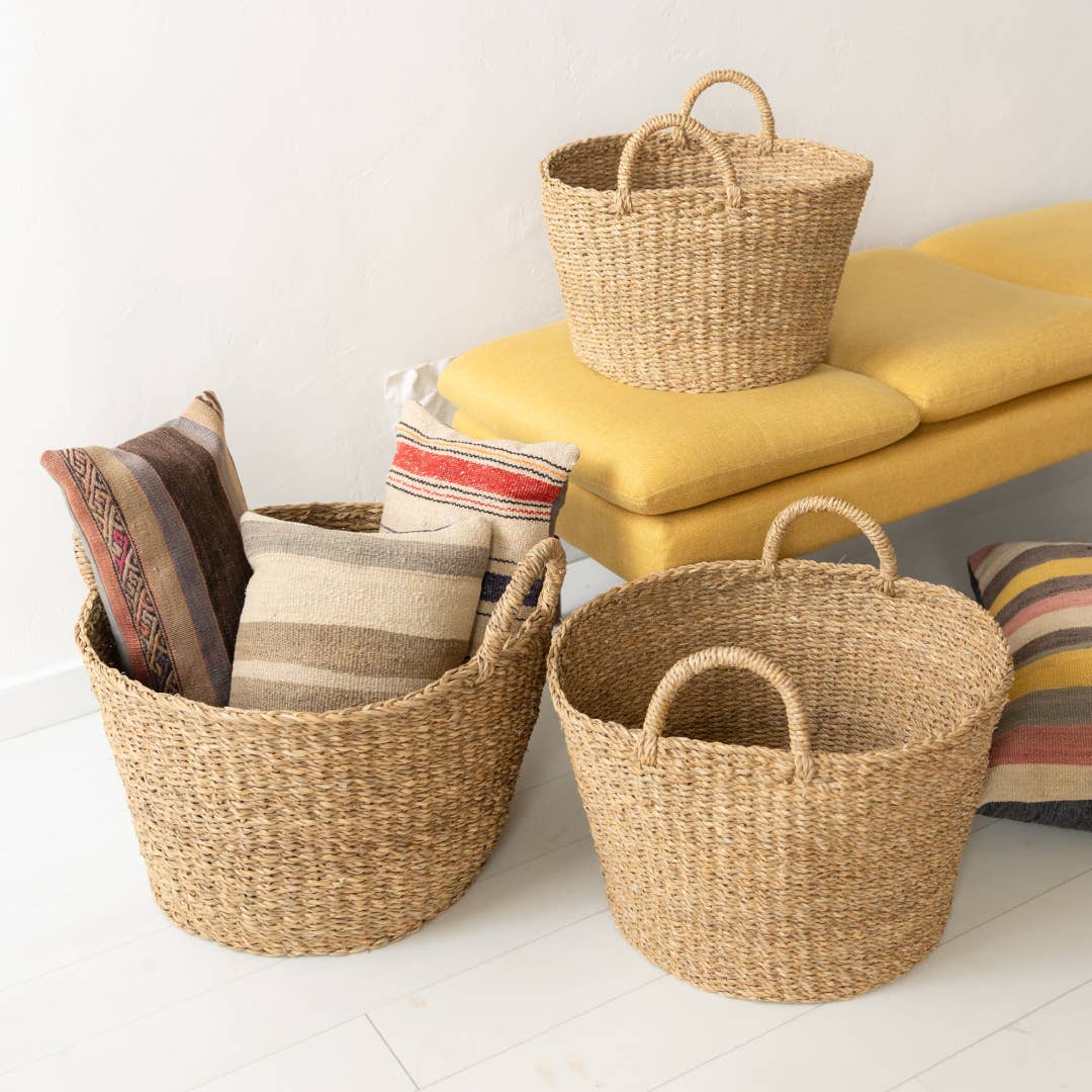 Deze veelzijdige manden zijn handgemaakt van hoglagras, een waterplant. Door het weven ontstaat een ontwerp dat zowel licht als sterk is, met lagen van natuurlijke textuur en kleur. Deze veelzijdige manden zijn verkrijgbaar in drie maten - klaar om uw wasgoed te verwerken, hoe groot de stapel ook is!