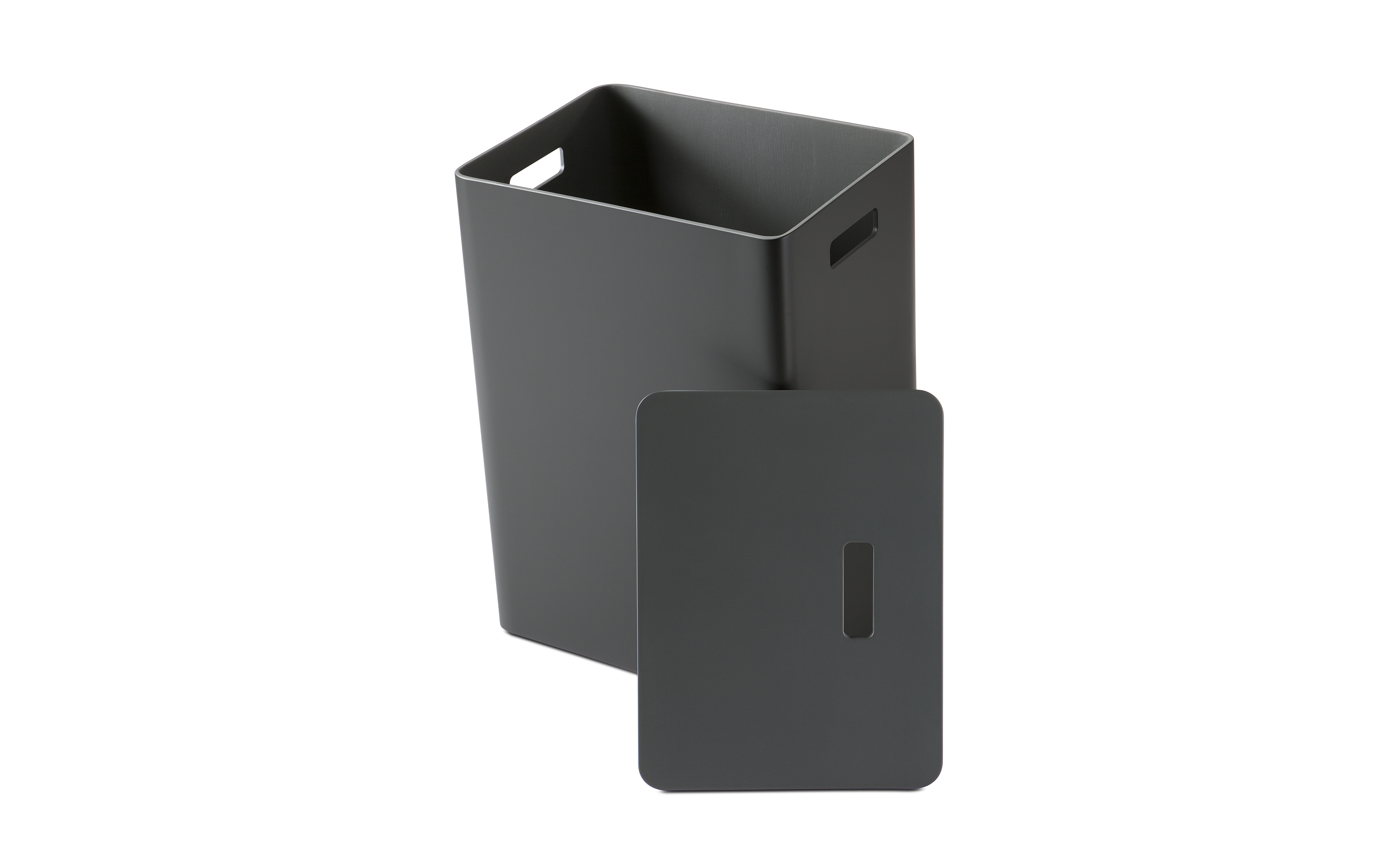 Wooden linen basket with integrated handles on the sides and in the lid. The unique oblique shape is typical for this design.