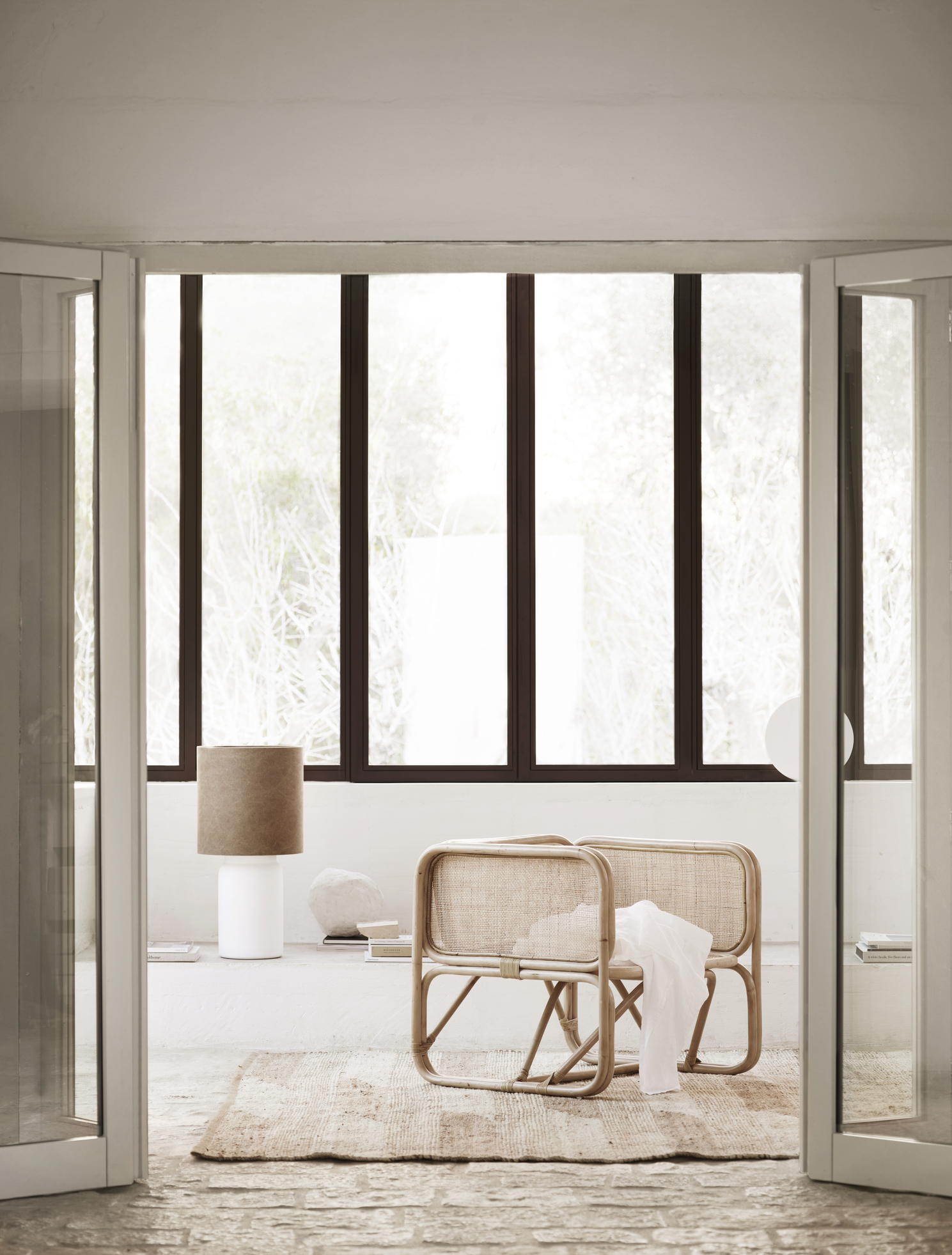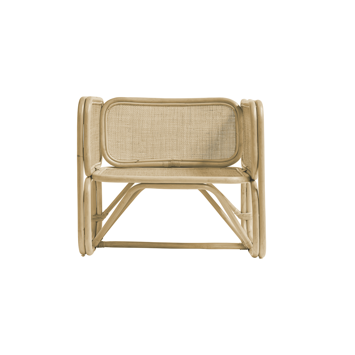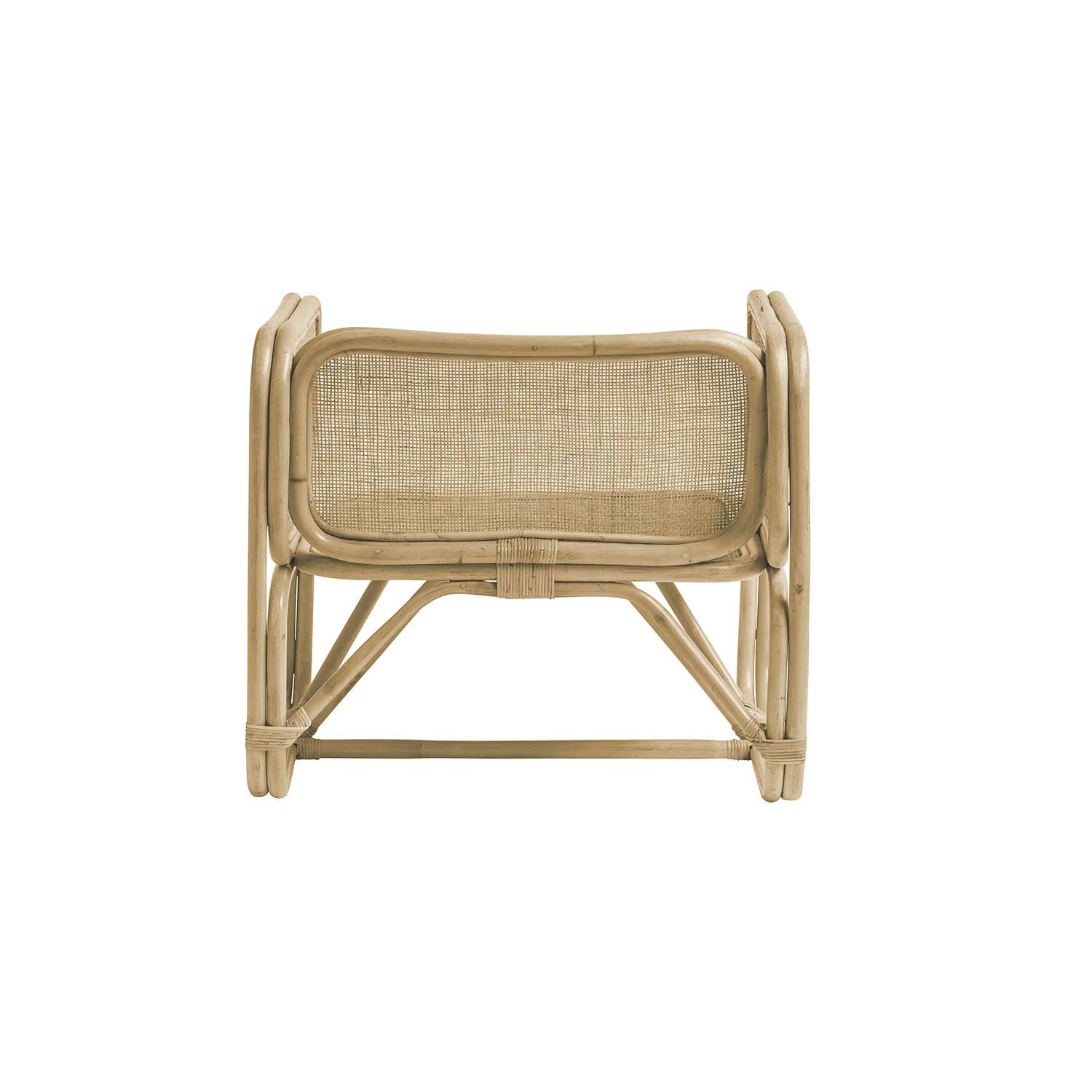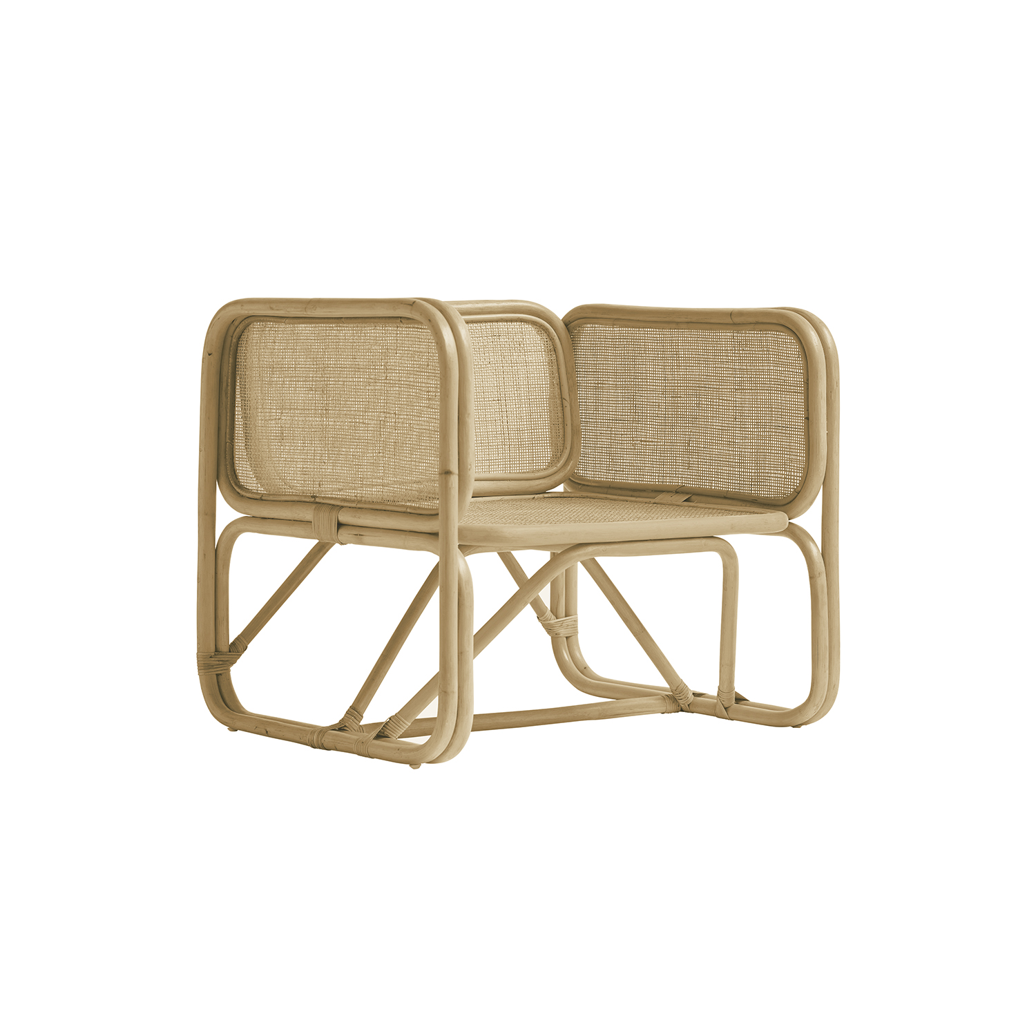 Wide low seat with rattan frame and cannage finish.