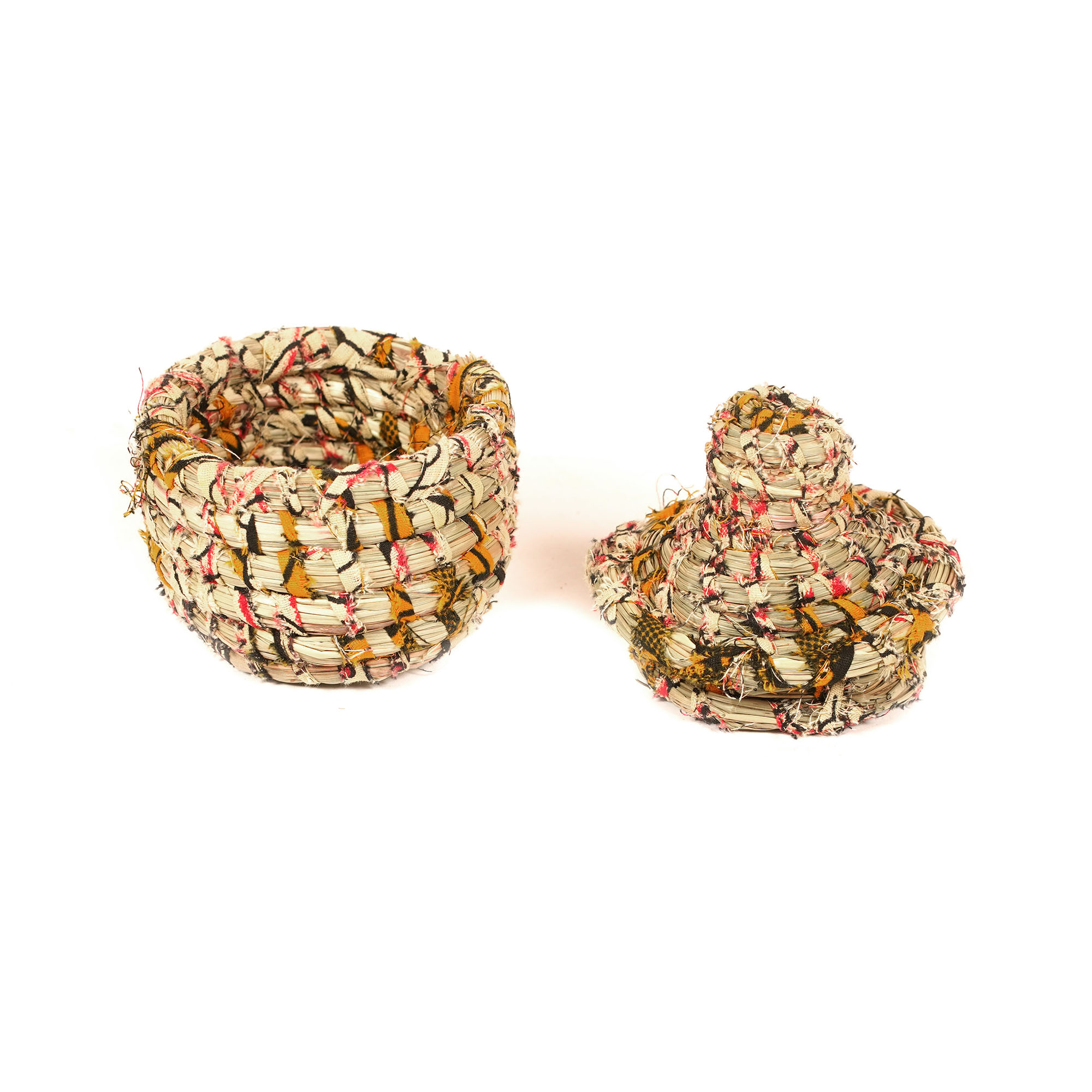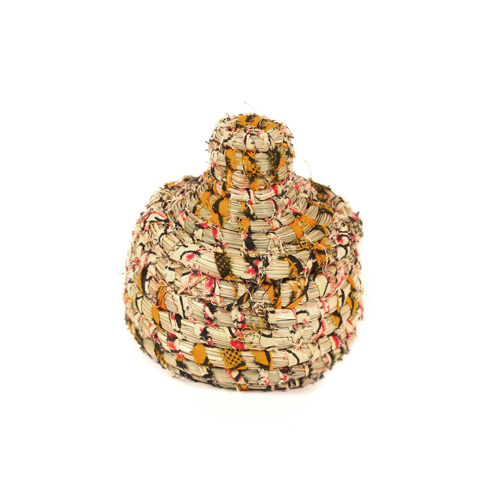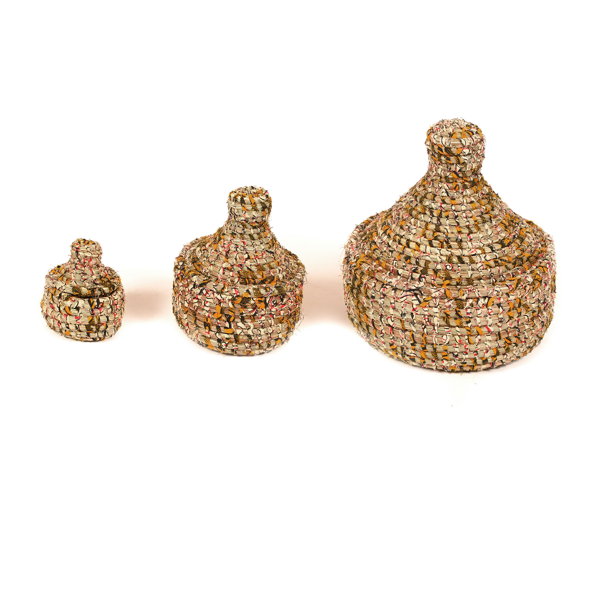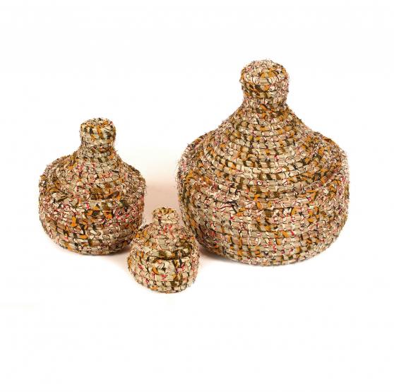 Ces paniers sont tissés dans l'herbe et finis avec du fil de coton.