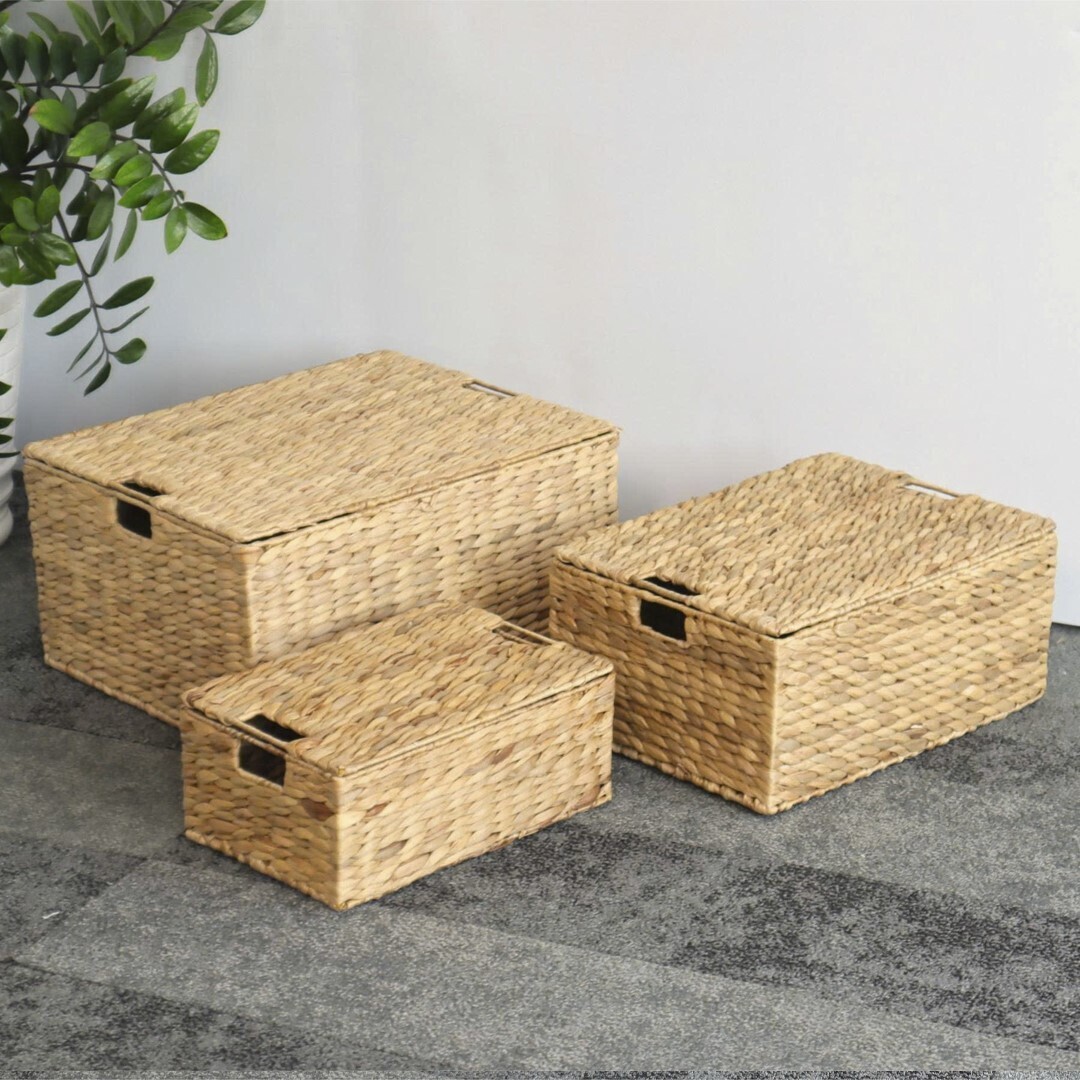 Praktische dozen met klepdeksel, gevlochten op een metalen frame met geïntegreerde grepen.