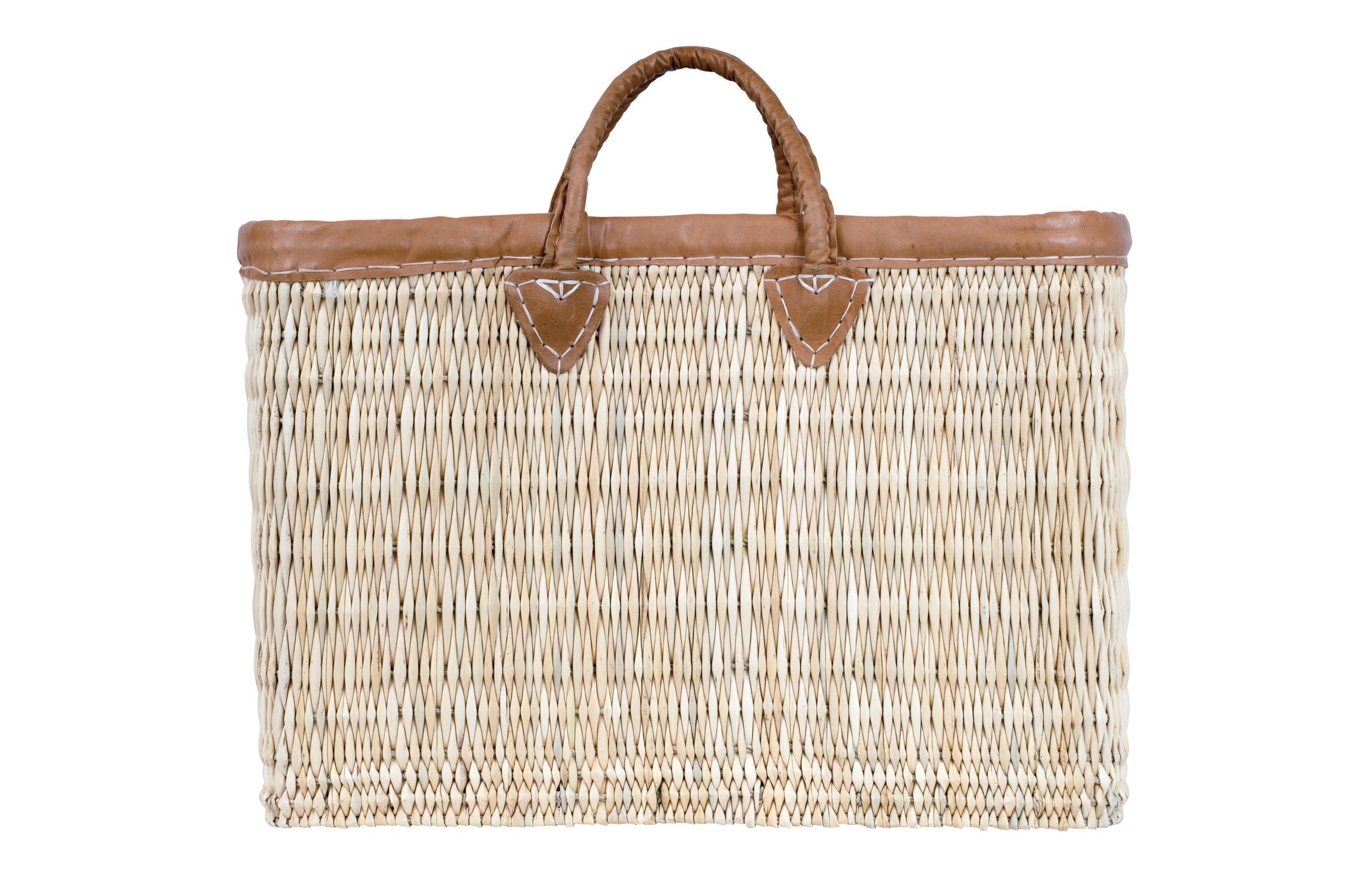 Tas van riet met leren afwerking – handgemaakte elegantie en stevigheid met leren randen en handvatten.